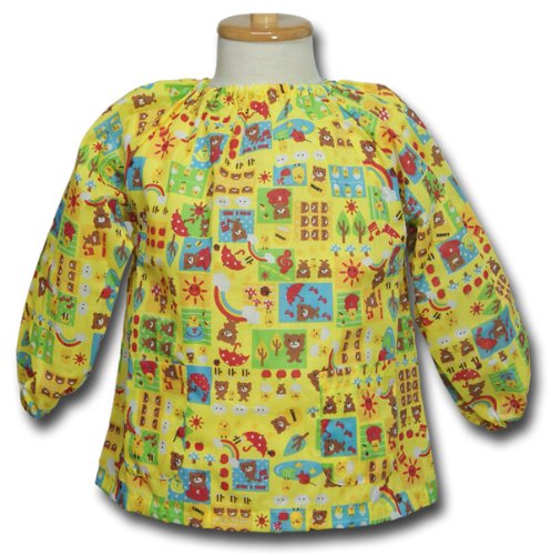 乗り物・クルマ・昆虫・ハート・りんご・ウサギ・風船・クマさんなど、小さい子に人気の絵柄を頭からスポッとかぶれるスモックにしました。