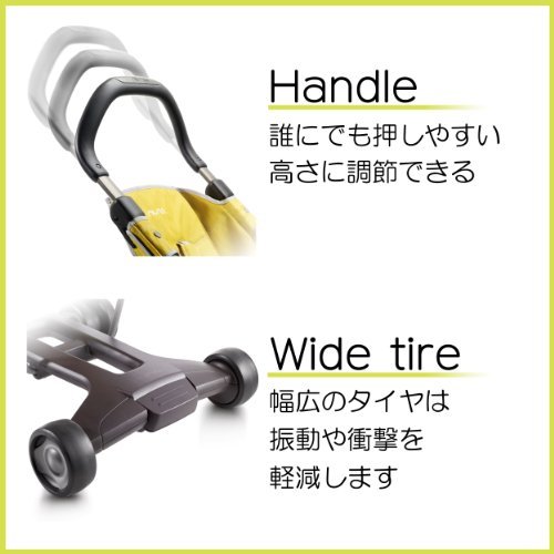 細かに高さ調節が可能なハンドルなので(高さ最大105cm~89cm)誰にでも押しやすい。 ハンドルがつながっているので片手でも安定した走行が可能。 F1のように太いタイヤは細かな振動や衝撃を和らげます。 ベアリングを使用しているので操作が軽やか。