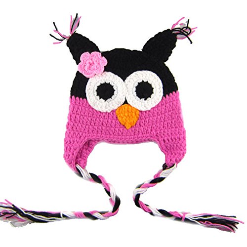 PANCY 春秋冬 ベビー 帽子 あったか 縄付き ニット帽 女の子 男の子 可愛い フクロウ 手編み プレゼント 出産祝い 記念撮影 防寒グッズ(黒+ローズ)