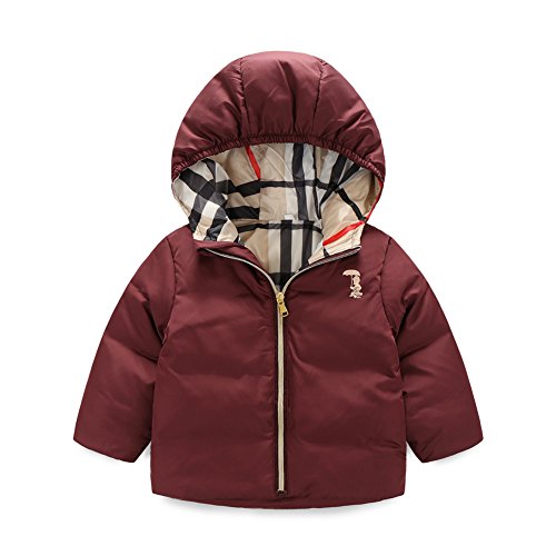 PANCY 子供服 秋冬 長袖 ダウンジャケット ダウンコート キッズ フード付き 厚手 無地 男の子 女の子(90cm,ワインレッド)