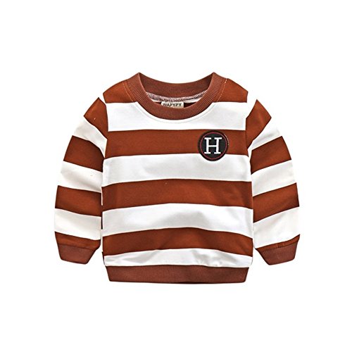 PANCY 子供服 春秋 長袖 Tシャツ キッズ トレーナー 丸い襟 男の子 女の子 シンプル ストライプ 縞柄 刺繍(ブラウン,120cm)