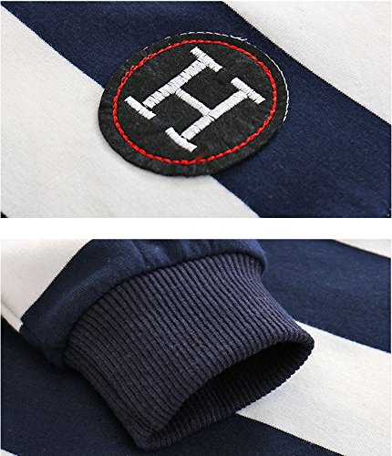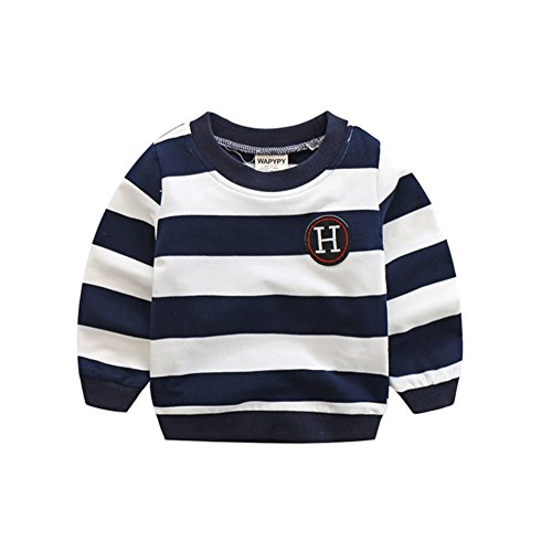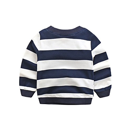 PANCY 子供服 春秋 長袖 Tシャツ キッズ トレーナー 丸い襟 男の子 女の子 シンプル ストライプ 縞柄 刺繍(ネイビー,90cm)