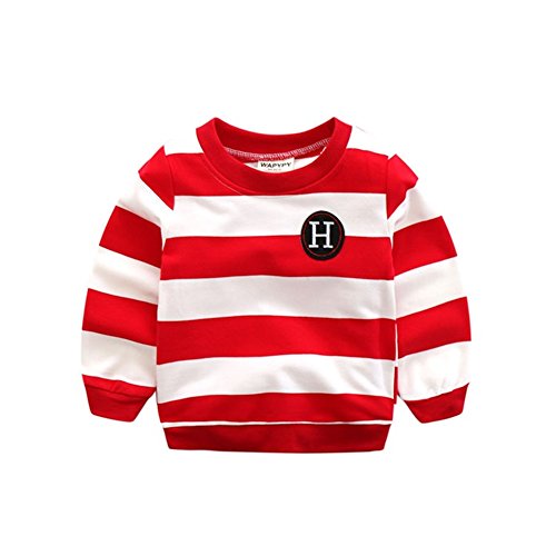 PANCY 子供服 春秋 長袖 Tシャツ キッズ トレーナー 丸い襟 男の子 女の子 シンプル ストライプ 縞柄 刺繍(レッド,100cm)