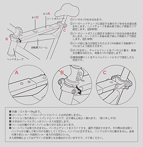 - 【ご注意】レーシングタイプなど(ドロップハンドル等)、一部の自転車には取り付け出来ません。/製造時期によりデザインが多少異なる場合がございます。/1歳未満のお子様は乗せないで下さい。/乗用の際は、必ずヘルメット・シートベルトを着用して下さい。