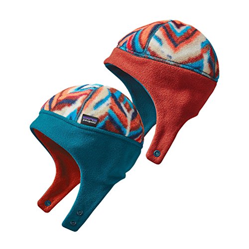 寒い場所でもなんとか帽子を脱ごうとする赤ちゃんの試みを食い止めて頭を温かく守ります。素材は寒さをかわすとても快適なポリエステル・フリース100%(無地はリサイクル・ポリエステル85%)。中央のパネルにより頭にぴったりとフィットするデザインで、生地を二重に使用した縁は冷気の侵入を防ぎ、丸めても形くずれしません。イヤーフラップに付いた2つのスナップ留めで調節でき、楽しいプリント柄を採用し、下部にコントラストカラーの無地のパネルを施したリバーシブルのデザインです。