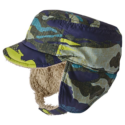 卵のような赤ちゃんの頭を目玉焼きくらいの温かさに保つミリタリー・スタイルの帽子です。悪天候に対応するDWR(耐久性撥水)加工済みのリップストップ・リサイクル・ポリエステル製シェルの内側はとても滑らかなポリエステル・ハイパイル・フリースで温かく、長めのイヤーフラップが風雨から耳を守ります。イヤーフラップはお日様が出てきたら、スナップで帽子の上に留めることができます。ソフトなつばが日差しから顔を守り、パネル構造により頭の形に沿ってフィットします。