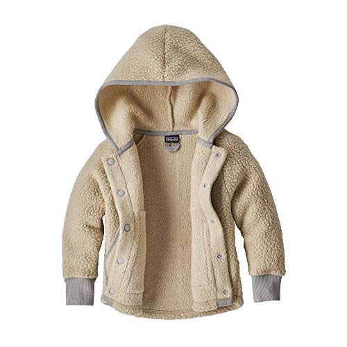 パタゴニアのベビー用フリース製品の中で最も温かいポリエステル100%の両面ソリッド・シアーリング・フリースで作ったジャケットです。腕の動きを妨げないラグランスリーブのデザインで、着せ替えしやすく手入れも容易。先のとがったノーム風のフードを備え、幅の広い前立てはオーガニックコットン・ツイルの縁取りと大型のスナップ留めが付いています。リブニットの袖口が温かさを閉じ込め、裾は腰をカバーするシャツ型です。ハンドウォーマーポケットと、おさがりの履歴を残せるIDラベルが付いています。
