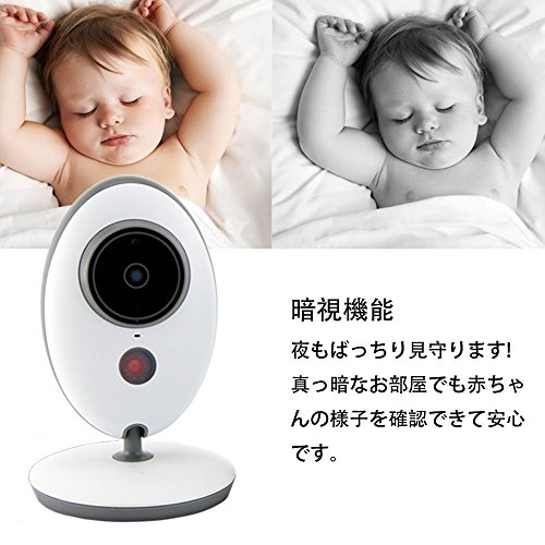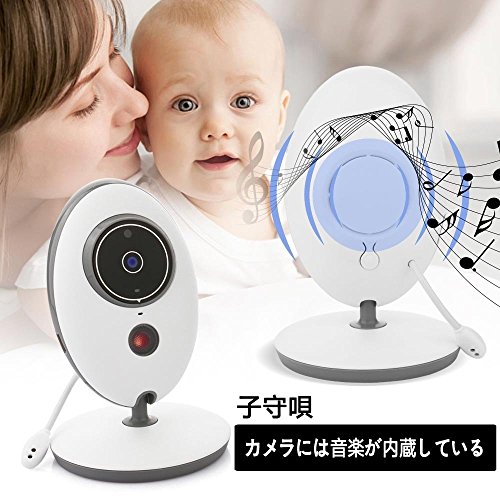 【1】2way音声機能(マイク・スピーカー付き)カメラとモニターにはマイクとスピーカーが搭載しているから、話しけることができます。いつでもベビーの声を聞こえて、ベビーと通話して安心することができる。(注意:音に干渉がある場合は、カメラを別の場所に移動し、ほかの電気回路に近く内容にしてください。) 【2】暗視機能:赤外線ライトが付くので、暗く夜ても見えることができます。寝かしつける時も便利ですが、別々の部屋にいても安心! 【3】操作簡単:ネットに接続する必要がない、カメラとモニターは電源を接続すると画像が映ることができる。 【4】子守唄機能:(4曲搭載)子守唄内蔵されており、ベビーモニターでの遠隔操作によって、ベビーカメラからとしてメロディを再生可能。赤ちゃんや子供に為のクラック音楽である。 【5】温度・湿度表示機能:赤ちゃんの寝室の温度や湿度を測ることができる。