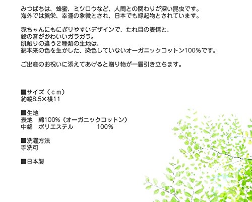 みつばちは、蜂蜜、ミツロウなど、人間との関わりが深い昆虫です。 海外では繁栄、幸運の象徴とされ、日本でも縁起物とされています。 赤ちゃんにもにぎりやすいデザインで、たれ目の表情と、 鈴の音がかわいいガラガラ。 肌触りの違う2種類の生地は、綿本来の色を生かした、 染色していないオーガニックコットン100%です。 ご出産のお祝いに添えてあげると贈り物が一層引き立ちます。