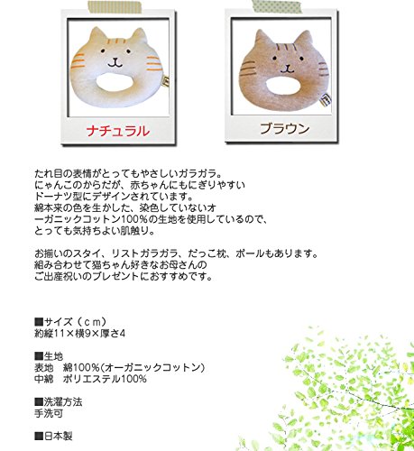 たれ目の表情がとってもやさしいガラガラ。 にゃんこのからだが、赤ちゃんにもにぎりやすいドーナツ型に デザインされています。 綿本来の色を生かした、染色していない オーガニックコットン100%の生地を使用しているので、 とっても気持ちよい肌触り。 お揃いのスタイ、リストガラガラ、だっこ枕、ボールもあります。 組み合わせて猫ちゃん好きなお母さんのご出産祝いのプレゼントに おすすめです。