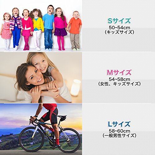 - Sサイズ:50~54cm(キッズサイズ) Mサイズ:54~58cm(女性、キッズサイズ) Lサイズ:58~60cm(一般男性サイズ)