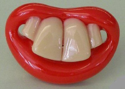 What name meaning would you come up with for a baby genius other than LIL PROFESSOR. My baby can't smile without showing some big pearly whites with this fun baby pacifier. This Billy Bob Pacifier comes with our silicone orthodontic NUK style soother that my baby loves. For Halloween or just cute baby photos, this baby pacifier gets lots of attention. How about the baby lyrics, I do say old chap.;All have silicone orthodontic nipples, that are 100% safe, B.P.A. free and Phthalate free;All are new and in orginal packaging.;Billy Bob Teeth branched out into the baby world with the introduction of their novelty, orthodontic pacifiers. Unlike traditional, monotone pacifiers, Billy Bob Pacifiers are designed to keep baby happy and parents grinning from ear to ear.;Ages 3 months to 99 years