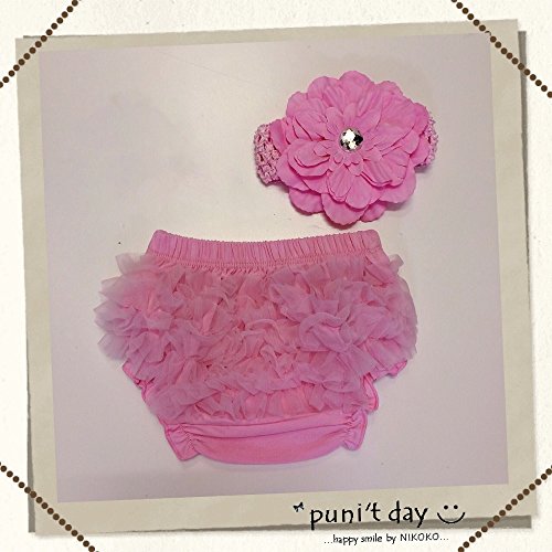 puni't day(プニットデー) ベビー ふりふりパンツ お花ヘアバンドセット ブルマ オーバーパンツ子供 トレーニングパンツ ドレス下着 レース チュール インナー ピンク ホワイト A3 (ピンク)