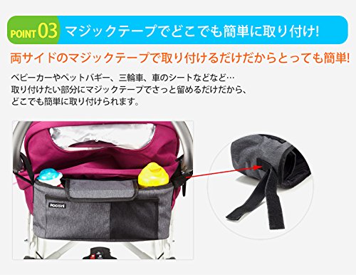 長く使っても型崩れしないようバッグの上部には太めのワイヤーが入っているので、同じ形で長く丈夫に使えます♪ジッパーポケットやオープポケット、メッシュポケット、ドリンクホルダー(2か所)など多様な収納スペースがあるので、ちょっとしたお出かけならカバン要らず!ふた付きなので荷物の落下や盗難防止にも◎サイドのマジックテープでフレームに巻き付けるだけだから、ベビーカーやペットバギー、車など必要に応じて付け替えもできます。カラーはデニム地のような雰囲気のグレーの生地を使用。どんなベビーカーにも似合うデザイン☆※こちらの商品は韓国で販売されている商品となりますので、パッケージに韓国語表記がございますので予めご了承ください。