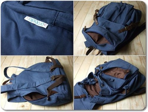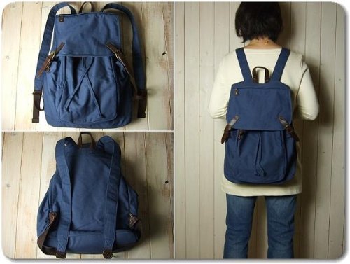 さらっとした薄手のキャンバス生地にフェイクレザーを使い合わせたリュックです。フラップ開閉はスナップタイプでフラップ部分と前面に大きなファスナーポケットがあり、両サイドに500mlのペットボトルがすっぽり入るオープンポケット付き、内側にもオープンポケットが1つ付いています。ショルダーは長さ54~85センチの間で調節ができます。背面の大きなファスナー開口部から荷物の出し入れができ便利です。 使い勝手のいいポケット多めのデザインに個性的なスクエアフォルムが◎ 色違いも出品中です。(完売している場合もあります。)