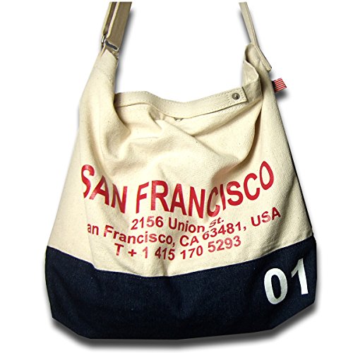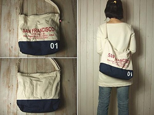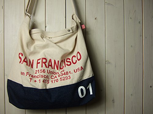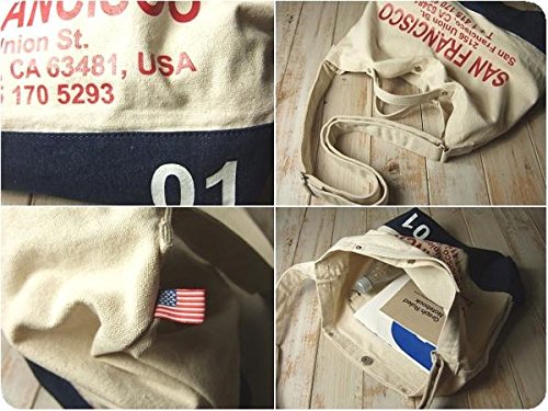 洗い晒し風のナチュラルなキャンバスにデニムやカモフラなどの異素材を使い合わせロゴをプリントしたショルダーバッグです。開口部分にはマグネット付きで、内側にDリング付きのオープンポケットが2つ付いています。ショルダーは幅3.7センチで長さは約60~114センチの間で調節可能です。ショートハンドル付きなのでトートバッグのように持つこともできます。 使い勝手のよいシンプルなフォルムでホワイトラバーのナンバーや国旗柄のタグがアクセントになっています。 色違いも出品中です。(完売している場合もあります。)