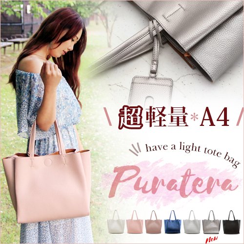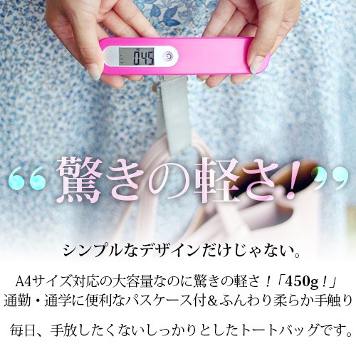 A4サイズ対応の大容量なのに驚きの軽さ!「450g!」 通勤・通学に便利なパスケース付&ふんわり柔らか手触りまで... 毎日、手放したくないしっかりとしたトートバッグです。 縦:約28cm 横:上部-約43cm、下部-約32cm マチ:約16cm 重さ:約450g