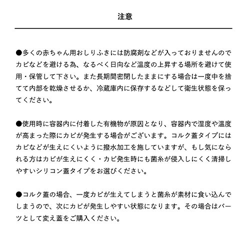 - 【注意】(1)多くの赤ちゃん用おしりふきには防腐剤などが入っておりませんのでカビなどを避ける為、なるべく日向など温度の上昇する場所を避けて使用・保管して下さい。また長期間密閉したままにする場合は一度中を捨てて内部を乾燥させるか、冷蔵庫内に保存するなどして衛生状態を保ってください。
