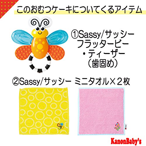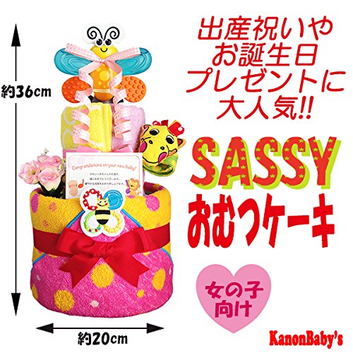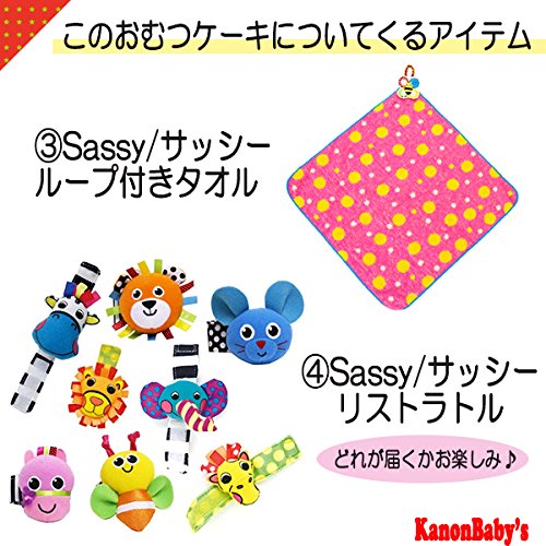 人気のSassy/サッシーのタオルやぬいぐるみ、おもちゃを使い、かわいいおむつケーキに仕上げておりますので、出産祝いはもちろん、内祝い、100日祝い、ハーフバースデー、初節句、お誕生日プレゼントに大変喜ばれるギフトです。