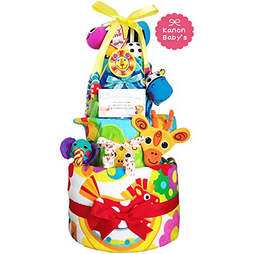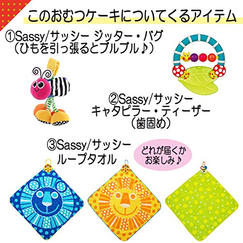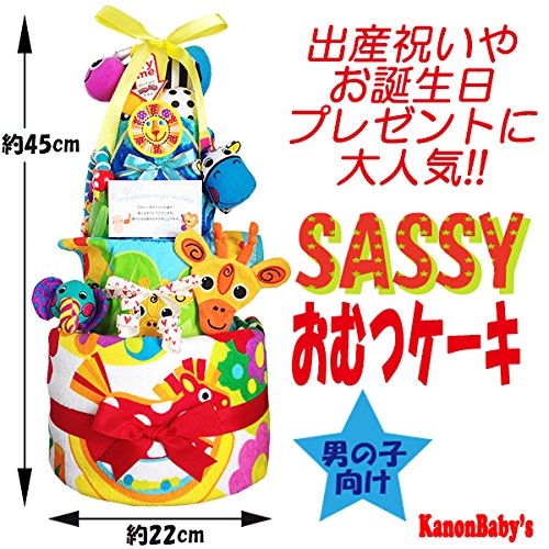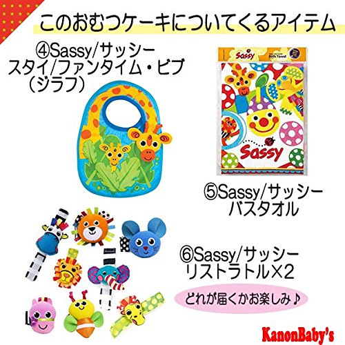 人気のSassy/サッシーのタオルやぬいぐるみ、おもちゃを使い、かわいいおむつケーキに仕上げておりますので、出産祝いはもちろん、内祝い、100日祝い、ハーフバースデー、初節句、お誕生日プレゼントに大変喜ばれるギフトです。