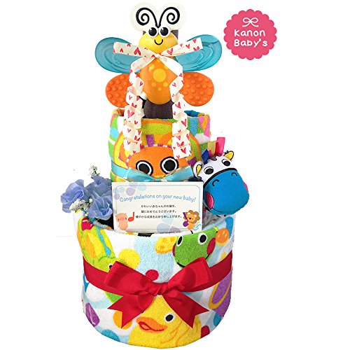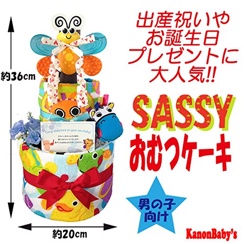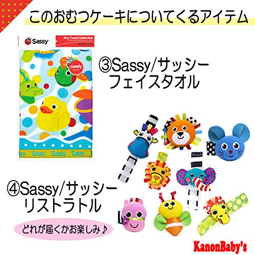 人気のSassy/サッシーのタオルやぬいぐるみ、おもちゃを使い、かわいいおむつケーキに仕上げておりますので、出産祝いはもちろん、内祝い、100日祝い、ハーフバースデー、初節句、お誕生日プレゼントに大変喜ばれるギフトです。