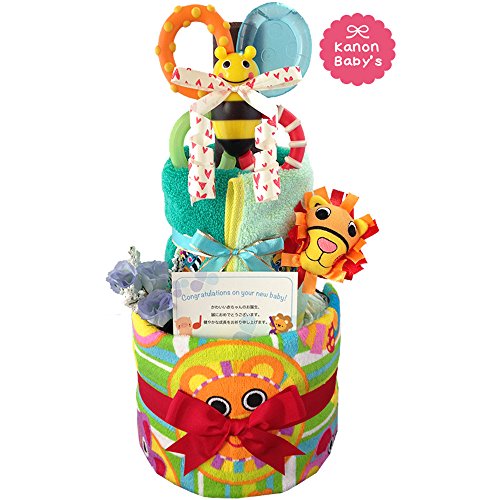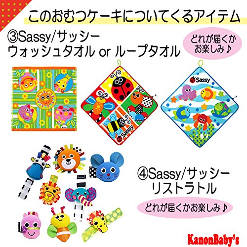 人気のSassy/サッシーのタオルやぬいぐるみ、おもちゃを使い、かわいいおむつケーキに仕上げておりますので、出産祝いはもちろん、内祝い、100日祝い、ハーフバースデー、初節句、お誕生日プレゼントに大変喜ばれるギフトです。