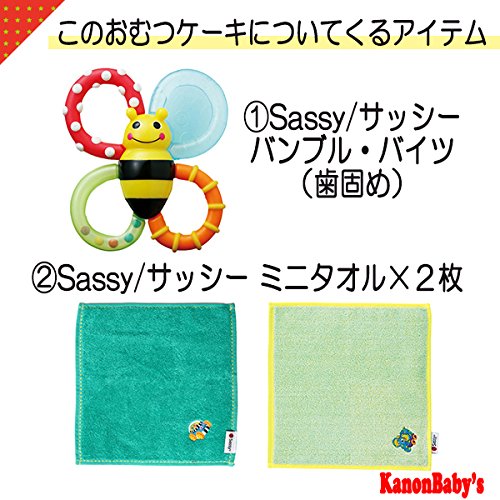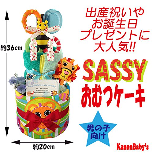 人気のSassy/サッシーのタオルやぬいぐるみ、おもちゃを使い、かわいいおむつケーキに仕上げておりますので、出産祝いはもちろん、内祝い、100日祝い、ハーフバースデー、初節句、お誕生日プレゼントに大変喜ばれるギフトです。