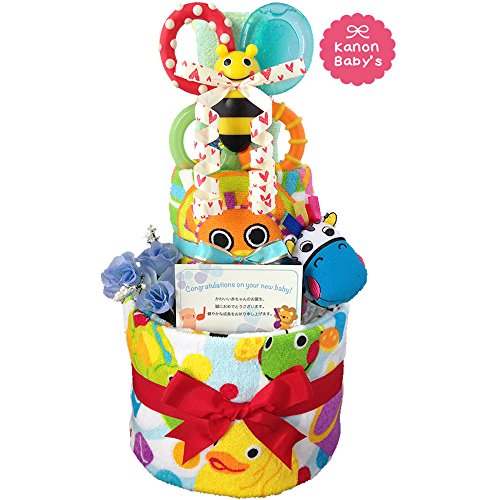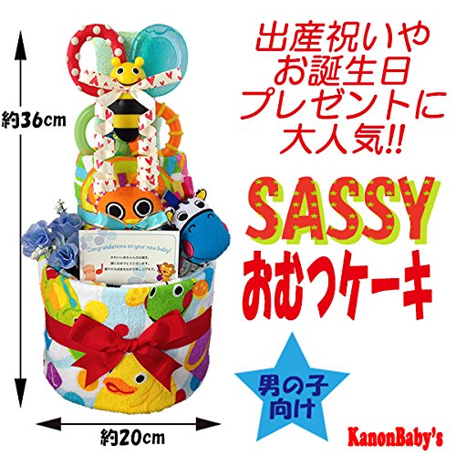 人気のSassy/サッシーのタオルやぬいぐるみ、おもちゃを使い、かわいいおむつケーキに仕上げておりますので、出産祝いはもちろん、内祝い、100日祝い、ハーフバースデー、初節句、お誕生日プレゼントに大変喜ばれるギフトです。