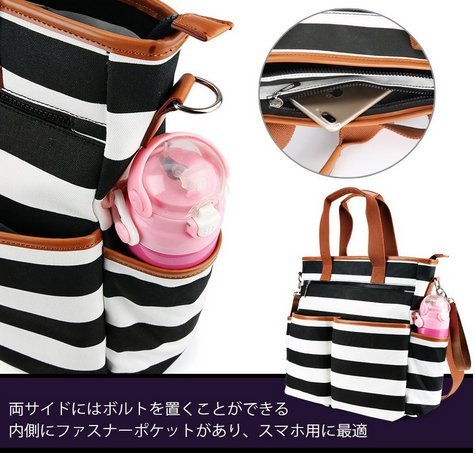 - 5.おむつ替えシート付:おむつ替えシートが1つ付き、マザーすバッグの背後に専門なシート用なポケットがあり、内側には4つおむつ用のポケットあり、野外でも楽に子供のむつを替えることができます。