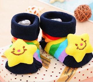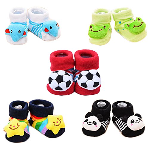 - 足先にマスコット(サッカーボール・星・パンダ・カエル・ゾウ)が付いた新生児用靴下5足セット。