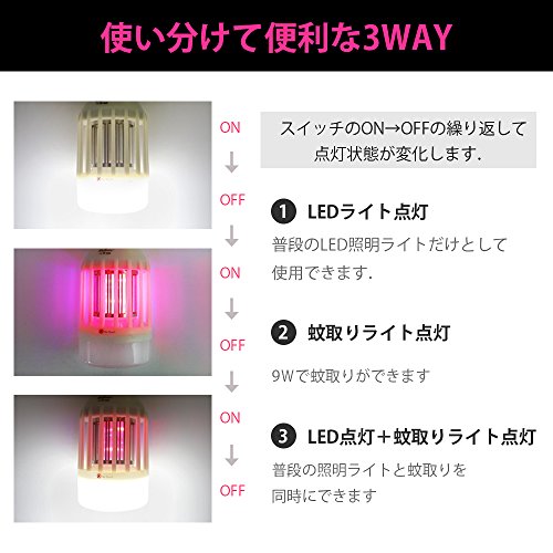 電撃殺虫灯 電気蚊取り器 小型誘虫灯 9W E26 LED照明ライト付き UVランプ効果 3way切り替え 日本語お取扱書 玄関 庭 事務所 ガレージ室内屋内専用 ノミバエ対策 昼白色