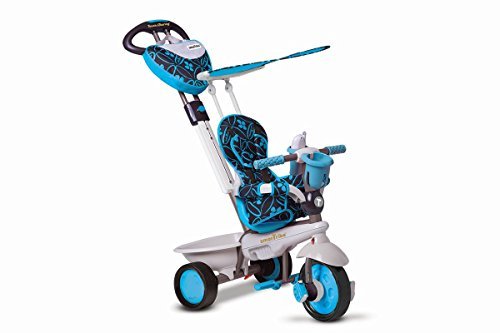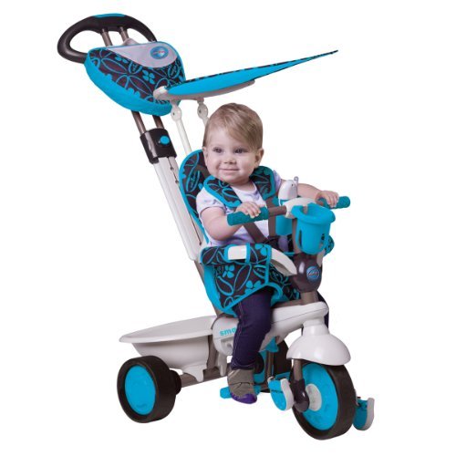 The smarTrike Dream is a unique 4 in 1 tricycle, designed for babies from 10 to 36 months old that grows with your child! Maneuvers easily with Touch SteeringTM technology - built-in suspension gives baby a 100% comfort ride. The trike's built-in clutch allows ride control by either parent or kid. Stage 1: At 10 months baby safely uses foot rest and has a padded high-back support. Stage 2: At 18 months the seat converts while parents push and control the trike. Baby enjoys the ride while developing confidence, balance and motor skills. Stage 3: At 24 months it becomes a training trike - kids learn to pedal. Stage 4: At 30 months, remove parent handle, close the safety clutch and it becomes an independent trike that kids pedal by themselves. The functional, washable, padded seat cover coordinated with the canopy & bag gives a fun, fashionable look to the trike! Versatile and safe - it's the adorable convertible.