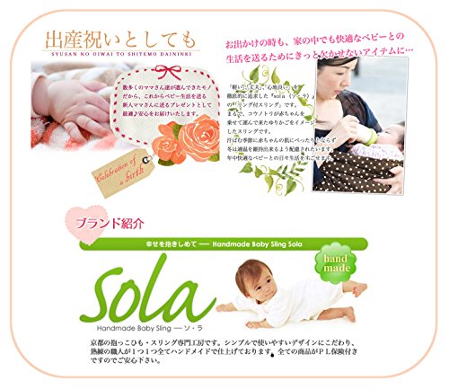 京都のハンドメイドスリング工房「sola(ソ・ラ)」のベビースリングです。人気No.1のシリーズです。最上質の綿素材ですので、汗をよく吸い、肌触りもしなやかで、大変やわらかくとても心地良いです。それにとても軽くて丈夫な素材です。さらに、幅サイズが約110cmの超余裕幅広ふかふかサイズですので、お母さんと赤ちゃんの安心感・安定感が他商品と明らかに違います。上品で落ち着いた色合いや素材感に、シンプルなデザインですので、お母さんのあらゆるファッションにもよく似合います。余裕の超幅広サイズ(長さ約170cm×幅約110cm)でお父さんでも大丈夫。コンパクトにまとまるので持ち運びにも便利。新生児~3歳位まで使用することができます。抱いたままの授乳も可能です。安心してご使用いただけるPL保険付の使用荷重60Kgのリングを使用しています。使用説明書付です。