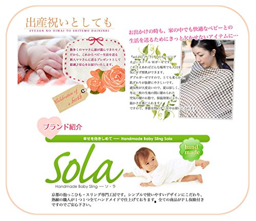 京都のハンドメイドスリング工房「sola(ソ・ラ)」の授乳ストールです。これさえあればどんな場所でも人目を気にせず授乳ができます。素材がWガーゼですので、とても柔らかく、肌ざわりが抜群にやさしいです。通気性が大変良いので、夏は涼しく、冬は二枚の生地の間に暖められた空気の層のお陰で、保温効果により、温かさを感じられます。ですので、季節を問わず一年中お使いになれます。また、ストールとしても、赤ちゃんのブランケットとしても使用できます。前面が、ボタンではなく、ファスナーですので、開閉位置の微調整がより自由にできます。ファスナーをしたままでもスポッとかぶることができますので、とにかく装着がとても楽チン&簡単です。長さ約150cm×幅約47cm(多少誤差があります)。コンパクトにまとまるので持ち運びにも大変便利です。(注)ファスナーの色は写真はブラウンですが、入荷状況によりホワイトになる場合もございますのであらかじめご了承下さい。