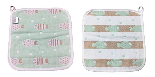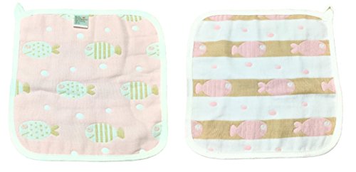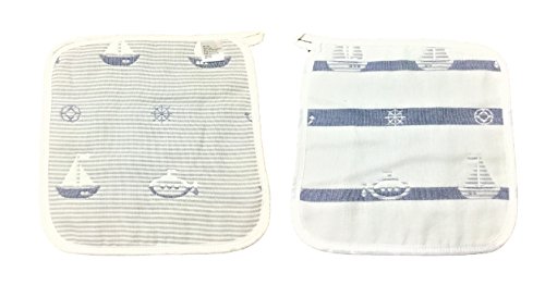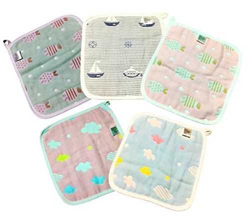 6重 ガーゼタオル ハンカチ 25CM ベビー 子供 幼稚園 保育所 ループ付 (5枚セット, 雲・魚・ヨット)