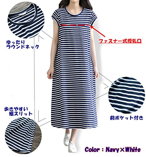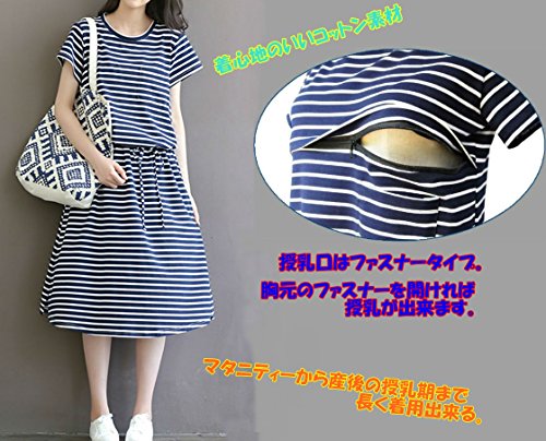 【Micopuella】 授乳口付き ワンピース 半袖 ボーダー マタニティワンピース 授乳服 (M)