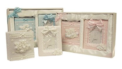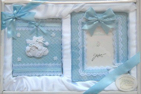 アルバムと写真立てをセットにした可愛いギフトセット。 花柄の刺繍のついた豪華な布飾りに赤ちゃんのブーティがペアになって飾ってあります。 アルバム、写真立てとおそろいです。