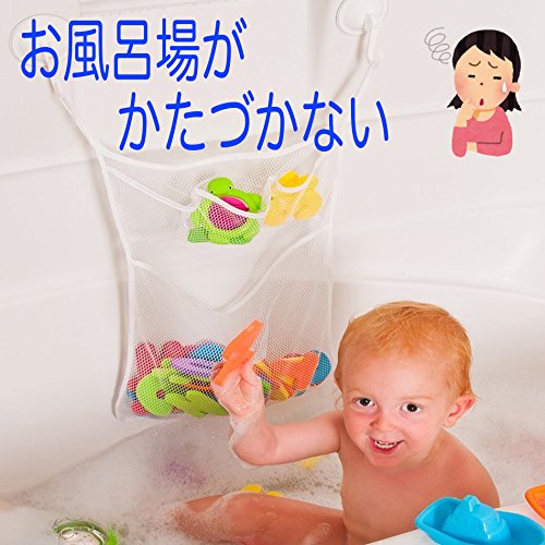 - なんでも口に入れたり、触ったりしてしまう赤ちゃんの手の届かないところに収納したいシャンプーやコンディショナー。お風呂で遊んだおもちゃの片付けや乾燥に便利なネットです。