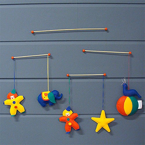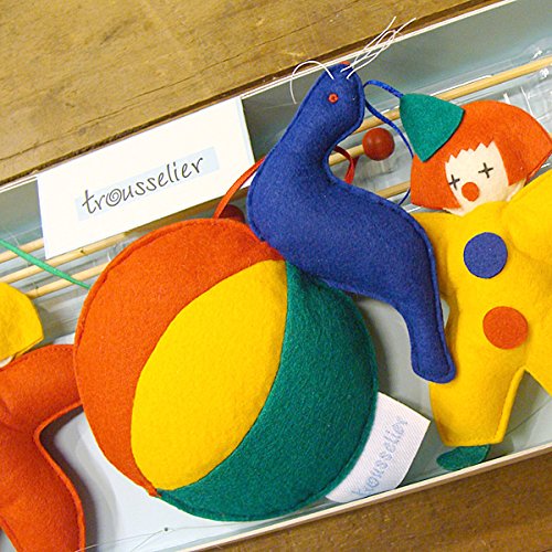 フランス、Trousselier(トラセリア)の赤ちゃんの追視にもオススメなインテリアモビールです。 ヨーロッパでは子供部屋のインテリアとして欠かせないモビール。 トラセリアのモビールは、子供部屋だけでなくリビングのおしゃれなインテリアとしても人気があります♪ ビビッドでカラフルなヨーロッパらしい色合いとモビールのサーカスの仲間たちのマスコットの組み合わせが抜群に素敵です。 布製のモビールは、バランスが難しいためあまり見かけませんが、トラセリアは布製にこだわり、大人の方でも、ほんわかやさしい気持ちにしてくれる、そんな安らぎを与えてくれるモビールに仕上げてます。 愛らしいマスコットたちが、お部屋の空気の流れでゆらゆらと動くので、ベッドメリーのかわりにベビーベッドの近くに吊下げてあげれば、赤ちゃんもずっと動く様子を楽しそうに眺めてくれます。