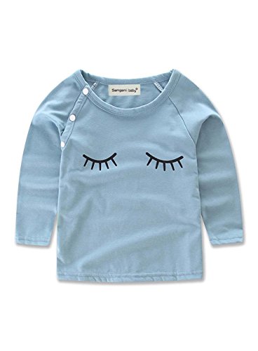 - つぶった瞳がキュートなトップスは、ややドルマン風の袖が特長。 今年トレンドのダスティブルーでおしゃれ度UP☆