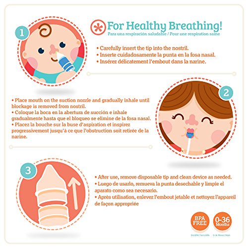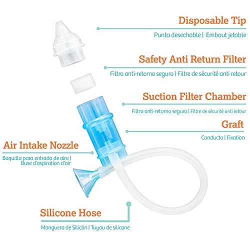 The No1 selling pediatric nasal aspirator in Europe;Gently and safely removes excessive nasal secretions allowing your child to breathe comfortably;Disposable filter prevents transfer of mucus and germs;Simple and easy to use;Simply insert tip into the nostril, place mouth on the suction nozzle and inhale until blockage is removed