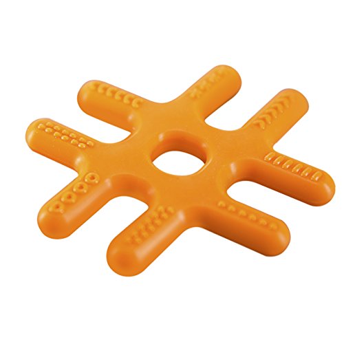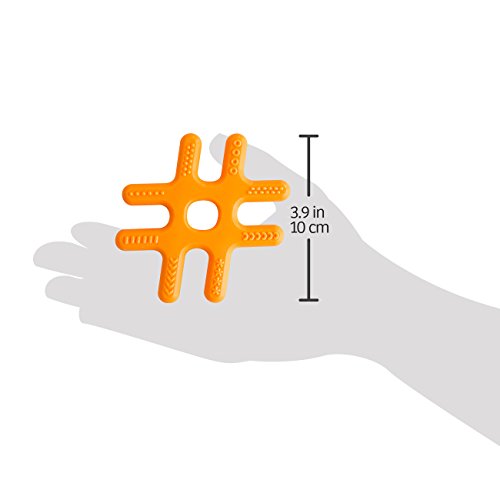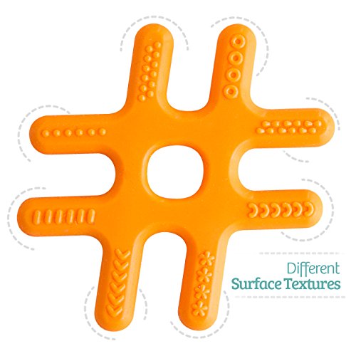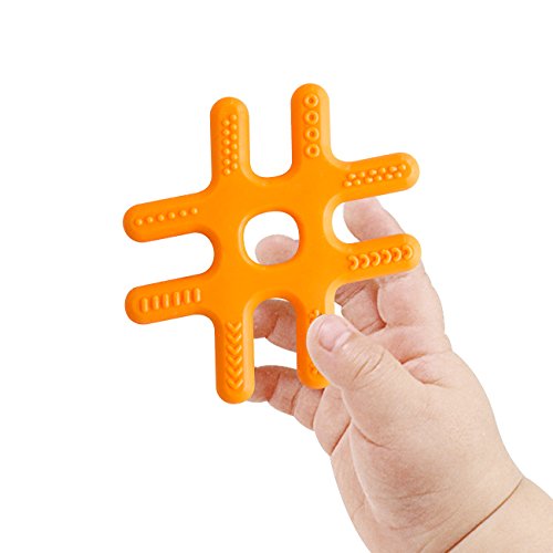 Silicone medical grade teether;Different silicone surface textures gently massage the gums as well as stimulate the child's play instinct and sense of touch;Features varying densities for a wide range of biting experiences;Ergonomic shape and light weight make teether easy to grasp and comfortable to hold;Made in USA