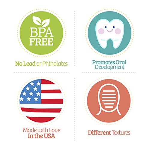 Silicone medical grade tether;Different silicone surface textures gently massage the gums as well as stimulate the child's play instinct and sense of touch;Features varying densities for a wide range of biting experiences;Ergonomic shape and light weight make tether easy to grasp and comfortable to hold;Proudly made in the USA