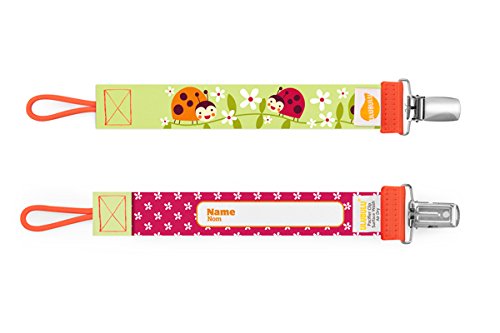 デンマークで設計されたおしゃぶりホルダー。他には無いデザインが人気です。 キュートな柄で目立つのは勿論、クリップ部分が金属製で強い強度があります。 おしゃぶりを振り回したりして遊ぶ赤ちゃんでも外せません。 おしゃぶりに繋げる部分はユニバーサルループになっていて、どんな形状のおしゃぶりにも付けられます。 おしゃぶりだけではなく、歯固めやおもちゃなどにも使えます。 ストラップ裏面には名前を記入する事もできます。洗濯可能。