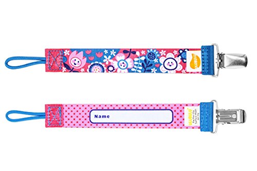 デンマークで設計されたおしゃぶりホルダー。他には無いデザインが人気です。 キュートな柄で目立つのは勿論、クリップ部分が金属製で強い強度があります。 おしゃぶりを振り回したりして遊ぶ赤ちゃんでも外せません。 おしゃぶりに繋げる部分はユニバーサルループになっていて、どんな形状のおしゃぶりにも付けられます。 おしゃぶりだけではなく、歯固めやおもちゃなどにも使えます。 ストラップ裏面には名前を記入する事もできます。洗濯可能。