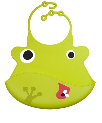 One silicone bib with easy close neck, 100% silicone that rinses clean, CPSIA tested & compliant, One frog silicone baby bib, Made of soft silicone that washes in the sink or dishwasher, Adjustable neck clasp without irritating velcro, Crumb catcher pocket on front keeps the mess off the floor