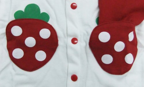 オールインタイプのカバーオールなので、動きが活発な赤ちゃんにもスムーズに着させやすくなってます。ポイントのイチゴの部分はポケットになっています。袖はゴムが入っておりずれにくくなっています。お祝いのプレゼントにも最適です。