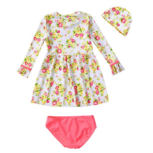 正規品 最新 子供水着 ワンピース 女児水着 3点セット 長袖 キッズ水着 ラッシュガード 帽子付き水着 スクール UPF50+素材使用 女の子水着 (3T(90-100))