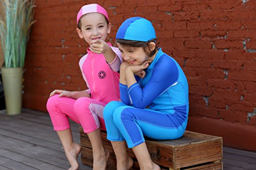 正規品 最新 女児水着 男児水着 三色 ラッシュガード キッズ水着 帽子付き水着 長袖 UPF50+素材使用 スイムキャップ付き (7T(110-120), ブルー)