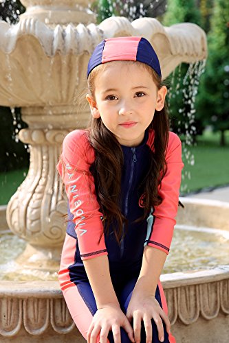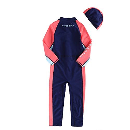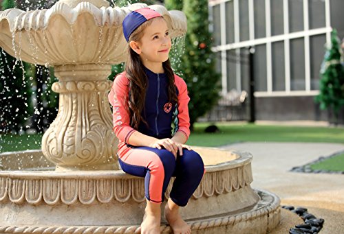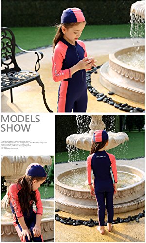 正規品 最新 女児水着 男児水着 三色 ラッシュガード キッズ水着 帽子付き水着 長袖 UPF50+素材使用 スイムキャップ付き (7T(110-120), 紺)